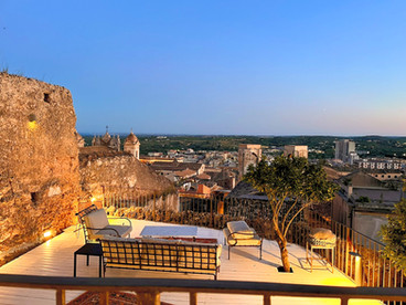 Denne takterrassen befinner seg høyt oppe i Noto Alta. Det vil si i den øverste bydelen av Noto. Den er litt skjult og er kanskje litt hemmelig denne terrassen. Ikke er den så lett oppdage fra utsiden av heller. Denne terrassen har panoramautsikt over Noto by for den ligger så høyt oppe. Er du så heldig å få sofaen som står nederst på terrassen så er det bare å sitte stille og ta inn utsikten og nyte solnedgangen gå ned over alle takene i Noto. Det gyldne lyset skinner på balkonger, hustak og naturen i det fjerne.